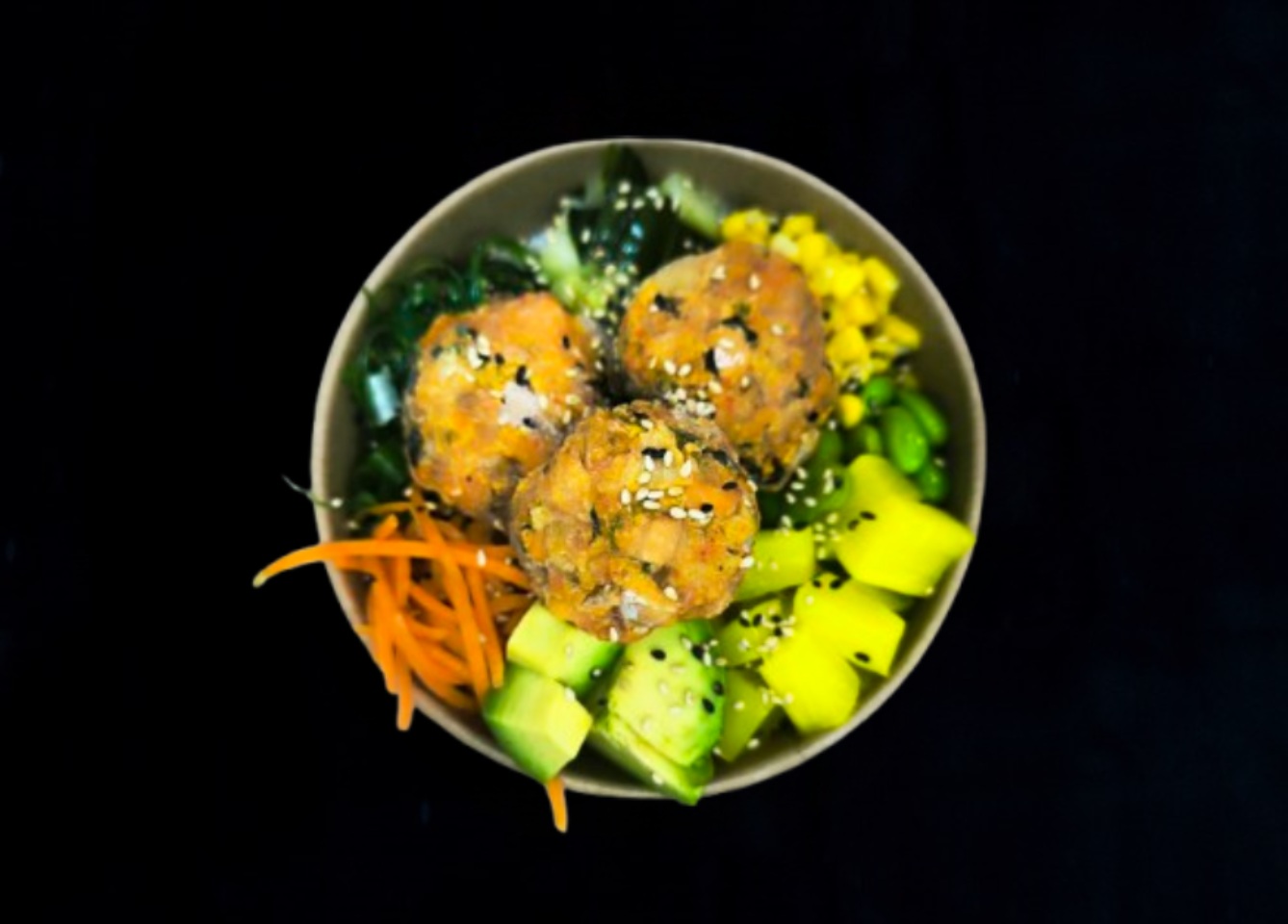 Pečené kuličky s lososem a kimchi, avokádo, oshinko, nakládaná okurka, edamame, goma wakame salát, jarní cibulka, kukuřice, smažená cibulka, sezam, dresing, rýže